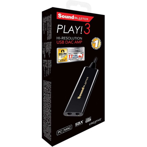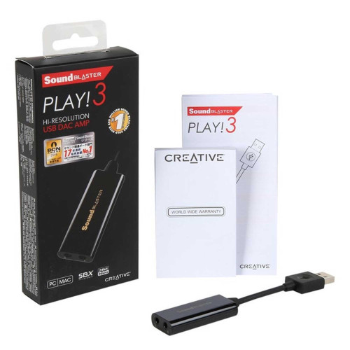 کارت صدای اکسترنال کریتیو مدل SOUND BLASTER Play 3 با رابط اتصال پورت USB عرضه شده و نیازی به منبع تغذیه خارجی نداره. این کارت صدا یک ورودی میکروفون و یک خروجی هدفون با جک 3.5 میلیمتری داره. امپدانس خروجی هدفون از 16 الی 300 اهم متغیر هست. این کارت صدا یک آمپلیفایر قدرتمند داره که از تکنولوژی SBX Pro بهرهمنده و با نرخ نمونهبرداری پخش صدای 48 کیلوهرتز و کیفیت صدای خروجی با رزولوشن 24-bit 96kHz، کیفیت بالایی از انتقال و پخش صدا رو ارائه میکنه.