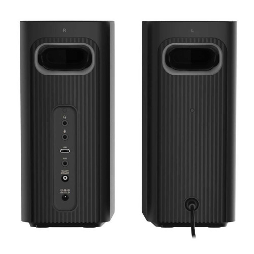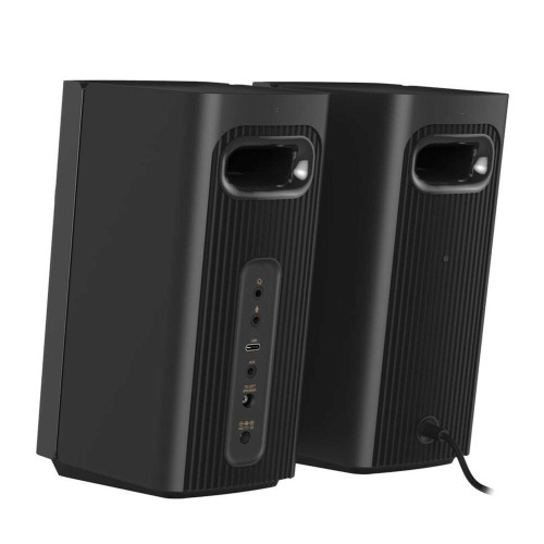 دو اسپیکر چپ و راست به وسیلهی یه کابلی با طول 2 متر به هم وصل میشن، و همچنین یه کابل AUX با طول 1.5 متر، هم اون رو به کامپیوتر، لپتاپ یا سیستمهای صوتی دیگه وصل میکنه. این اسپیکر دارای کلیدهایی از نوع مکانیکی داره که برای روشن و خاموش کردن، کم و زیاد کردن صدا و ... ازش استفاده میشه.