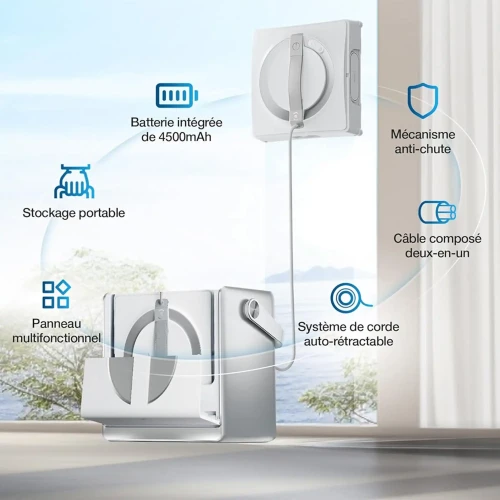 | سایر ویژگی ها | سطح نویز 65 دسیبل | ولتاژ کاری 110 ولت | چندزبانه (صوتی و متنی) | حسگرهای متعدد برای پاکسازی بدون وقفه، شامل شتابسنج و تشخیص لبه | 12 مرحله محافظتی شامل سختافزار و نرمافزار، باقیماندن روی شیشه تا 30 دقیقه پس از قطع برق | اپلیکیشن هوشمند ECOVACS HOME |
