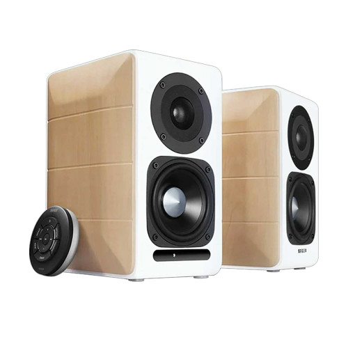 این اسپیکر وزنی حدود 7.5 کیلوگرم داره و ابعادش 17 × 14 × 23 سانتیمتره. بدنه چوب MDF علاوه بر زیبایی، روی کیفیت و گرمی صدا هم تأثیر مثبت میذاره. طراحی مینیمال ولی حرفهای این مدل، با ترکیب رنگ روشن و ظاهر کلاسیک، باعث میشه به راحتی با دکوراسیونهای مختلف هماهنگ بشه. همچنین وزن نسبتاً سنگین دستگاه نشون میده با یه محصول جدی و قدرتمند طرف هستیم که برای استفاده ثابت روی میز یا قفسه طراحی شده.
