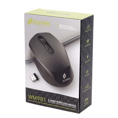 ماوس بی سیم Eleven مدل WM901 محصولیست که شباهت زیادی به ماوس بیسیم تولید شده دیگه داره و از نظر ظاهری یک ظاهر کاملا مدرن، زیبا و بینقص اما تکراری خواهد داشت. طراحی اون باعث شده تا با دست راست قابل استفاده باشه. این ماوس از ابعادی 37*62*100 میلیمتر ساخته شده و با جنس پلاستک مقاوم ABS وزنی 46 گرمی داره. این ماوس مجموعا از 4 کلید مکانیکی بهرهمنده.