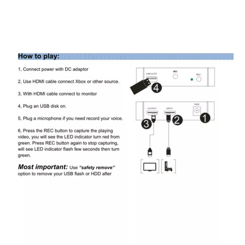 منبع تغذیه این محصول آداپتور سوزنی ۵V/۲A هست. این کارت کپچر 2 تا درگاه ورودی داره و تعداد درگاه خروجی اون 2تاست. فرمت خروجی ویدیوهای این کارت کپچر MPEG4 هست و میتونین ویدیوها رو با کیفیت Max 1080P 30fps روی فلش مموری و هارد اکسترنال ضبط کنین.