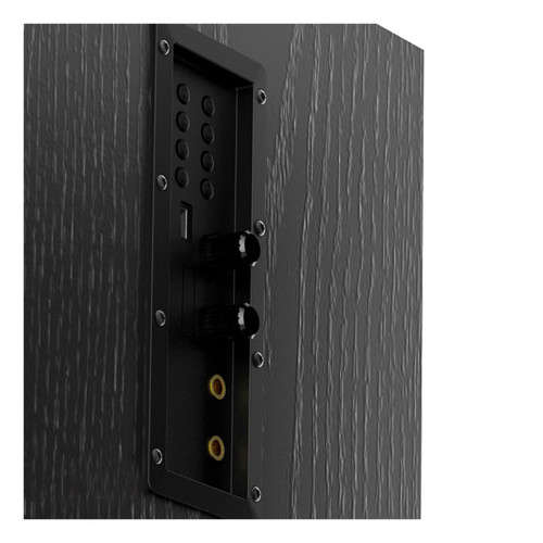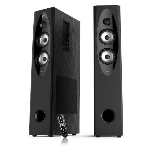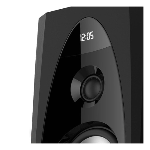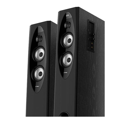 اسپیکر حرفه ای مدل T-60X محصولی از برند F&D است که بدنهی آن از روکش چوبی زیبا و با کیفیت در رنگ مشکی طراحی شده و همراه با یک ریموت کنترل با قابلیتهای فراوان، به بازار عرضه شده است. این اسپیکر حرفهای برای اتصال به گوشیهای موبایل، تلویزیون و پخش کنندههای صوتی از فناوری بلوتوث نسخه 4، پورت USB و قابلیت NFC بهرهمند شده است و از طریق بلوتوث میتوانید فایلهای صوتی خود را به آن منتقل کنید. این محصول از فرمتهای MP3 و WMA پشتیبانی میکند و با اتصال فلش مموری یا هارد اکسترنال به درگاه USB آن میتوانید فایلهای صوتی موجود در آن را پخش نمائید. میزان توان خروجی صدا اسپیکر حرفه ای F&D مدل T-60X برابر با 110 وات است که بهره مندی از ساب ووفور 8 اینچی و ووفر 4 اینچی، میتواند صدایی رسا و با کیفیت را در محیطهای متوسط و نسبتا بزرگ پخش نماید. یکی از قابلیتهای جذاب این محصول بهره بردن از قابلیت کارائوکه است که با اتصال میکروفن به اسپیکر میتوانید همراه با خواننده مورد علاقه خود خوانندگی را تجربه نمائید. منبع تغذیه این مدل از اسپیکر انرژی الکتریکی مورد نیاز خود را از طریق برق شهری تامین میکند. طراحی یونیتهای مختلف این اسپیکر کاملاً روی بدنه قابلدیدن هستند. توییتر، ووفر و سابووفر به تفکیک روی بدنه قرار گرفتهاند و به زیبایی بدنهی آن افزوده است. در قسمت بالایی بدنهی یکی از اسپیکرها یک عدد صفحهنمایش LED قرار گرفته است که به شما وضعیت اتصال دستگاه و ساعت را نشان میدهد. درمجموع این سیستم صوتی باقرار گرفتن کنار تلویزیونهای تخت، ترکیب زیبایی را به وجود میآورد.