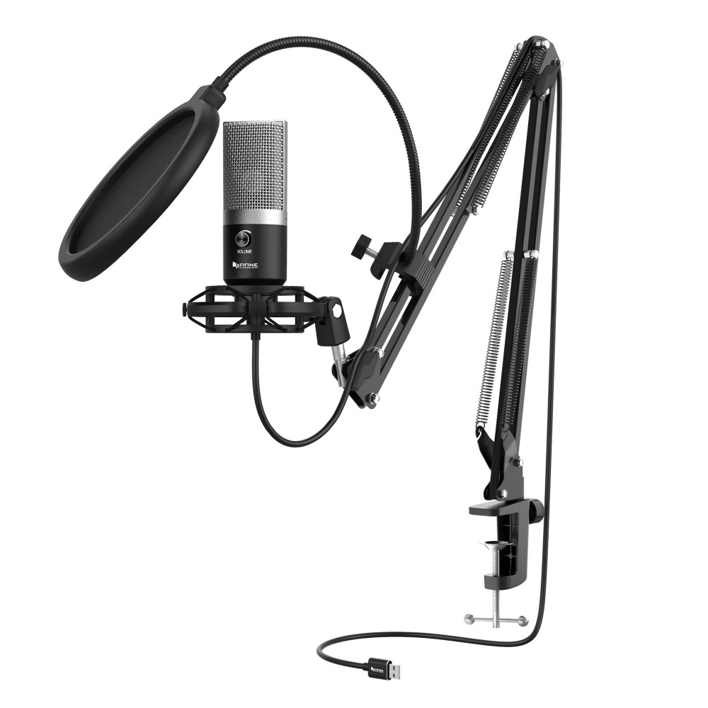 میکروفون استودیویی FIFINE مدل T670 یک میکروفون USB باکیفیت، با ساختار تمام فلزی است. این میکروفون مناسب برای ضبط ووکال، پادکست و گیمینگ است. این کیت میکروفونی باکیفیت از یک میکروفون، پایه بازویی، سه پایه رومیزی، شوک مونت، فیلتر نرم کننده صدا و پاپ فیلتر تشکیل شده است.