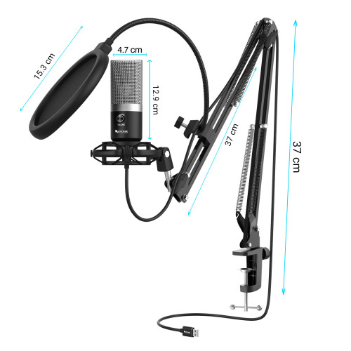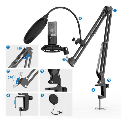 بوم بازوی قابل تنظیم این کیت میکروفون سیمی، انعطافپذیری کافی برای تنظیم در زاویه مناسب را میدهد و با قرار دادن میکروفون نزدیک به منبع صدا باعث میشود نویز بسیار کمتری از محیط جذب شود. پاپ فیلتر دو لایه این میکروفون نیز به خوبی نویزهای ناشی از اصوات و حروف صامت و انفجاری را فیلتر می کند. این مجموعه دارای یک سه پایه رومیزی و یک گیره C جداشونده است تا کل کیت را محکم بر روی میز نگه دارد. سیستم لرزهگیر این کیت میکروفونی نیز همچنین نویزهای ناشی از ضربه و تکانها را در حین ضبط کاهش میدهد. این پکیج شامل پایه بازویی از استیل مستحکم، لرزهگیر درجه یک استودیویی، پاپفیلتر دو لایه، کابل USB، سه پایه رومیزی، و یک میکروفون برای ضبط پادکست و دفترچه راهنما است.