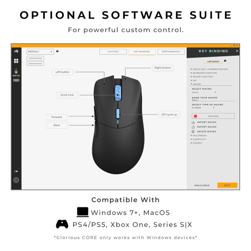 خیر، این ماوس بدون نیاز به نصب درایور روی سیستمهای Windows و Mac کار میکنه، اما میتونین برای تنظیمات بیشتر از نرمافزار Glorious Core استفاده کنین.