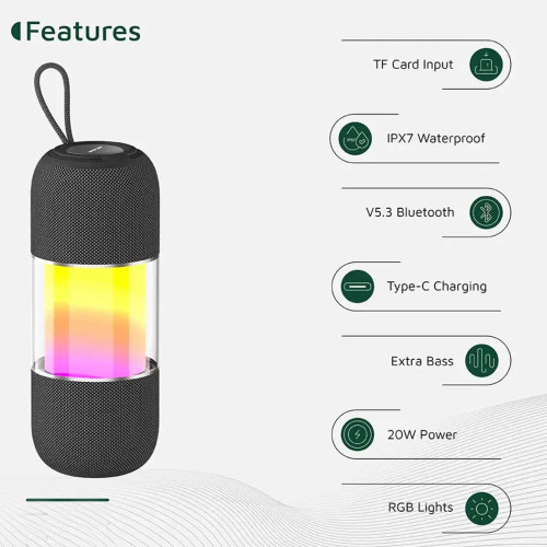 از نظر فنی، این اسپیکر با توان خروجی 20 وات، قدرت صدای بسیار خوبی ارائه میده و میتونه یه فضای متوسط مثل اتاق یا جمعهای دوستانه رو بهخوبی پوشش بده. تکنولوژی بلوتوث نسخه 5.3 باعث شده اتصال سریع و پایداری با دستگاههای مختلف داشته باشه و تا شعاع 10 متری، بدون قطعی یا تأخیر کار کنه.