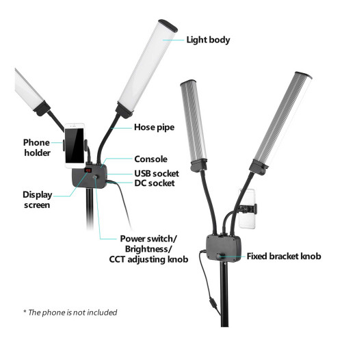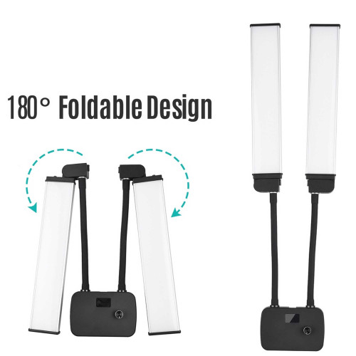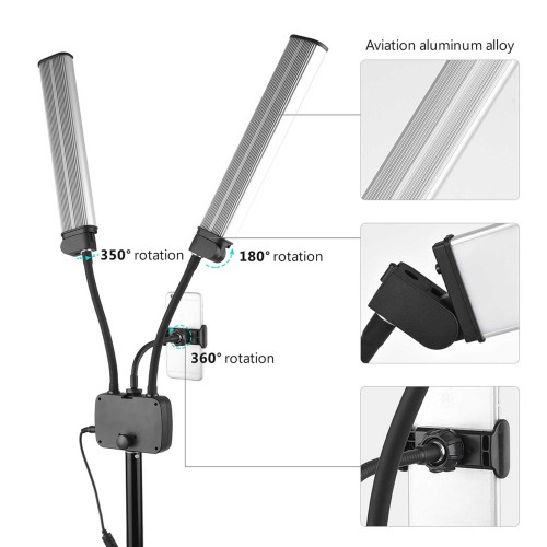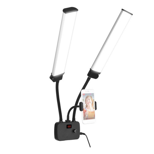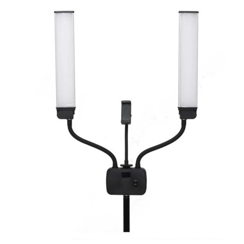 نور بازویی LED HD-45X 800 گرم وزن و 3 سانتیمتر ضخامت داره و سایز هر بازوی نور اون 28×6 سانتیمتره. این منبع نوری قابلیت چرخش رینگ به همه جهات رو داره؛ بنابراین محدودیتی بابت تنظیم زاویه اون ندارین. اگه به تصویر هم نگاه کنین، بین دو بازو یه هولدر برای قرار دادن گوشی طراحی شده که کار رو براتون سادهتر کرده. نور بازویی LED HD-45X، 224 تا LED داره که میتونین مقدار نورش رو خودتون تنظیم کنین.