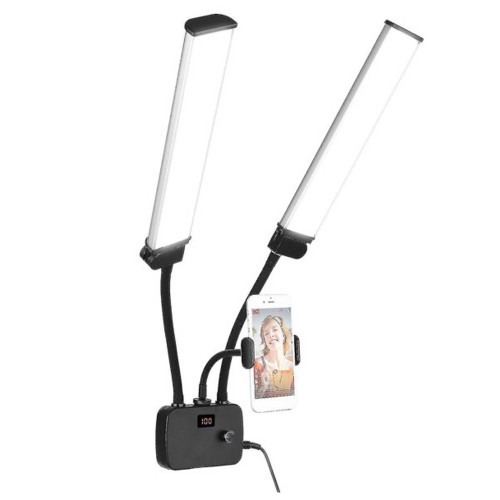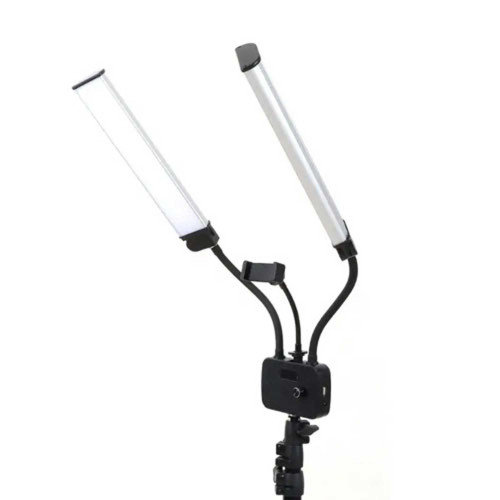 ابعاد این مدل 450 در 300 میلیمتر هست و در حالت کامل با پایه، ابعاد کلی اون به 450 در 300 در 800 میلیمتر میرسه. وزن دستگاه سبک طراحی شده و جنس بدنه از پلاستیک مقاوم ساخته شده که باعث میشه حملونقل راحتی داشته باشه. یکی از نکات مثبت طراحی این محصول وجود بازوهای قابل تنظیمه که انعطافپذیری بیشتری در نورپردازی به کاربر میده. به کمک این بازوها میشه زاویه تابش نور رو تغییر داد و نور رو متناسب با شرایط عکاسی یا فیلمبرداری تنظیم کرد.