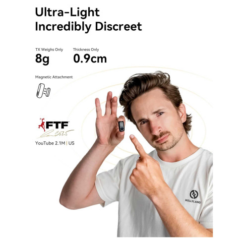 میکروفون یقه ای هالی لند LARK A1 Mini Duo با طراحی فوقالعاده سبک و جمعوجور ساخته شده. فرستنده این میکروفون فقط 8 گرم و گیرندهاش 5.9 گرم وزن داره که باعث میشه بهراحتی بتونین اون رو همراه خودتون حمل کنین. ابعاد فرستنده 30 × 16.3 × 8.8 میلیمتر و گیرنده 34 × 16.3 × 9 میلیمتره، یعنی بهاندازهای کوچیکه که تو جیب یا کیف بهسادگی جا میشه. بدنه مقاوم و طراحی ارگونومیک این محصول باعث شده که برای استفادههای طولانیمدت راحت باشه. یه کلید قطع و وصل میکروفون هم روی دستگاه وجود داره که کار رو برای کنترل سریع ضبط راحتتر میکنه.
