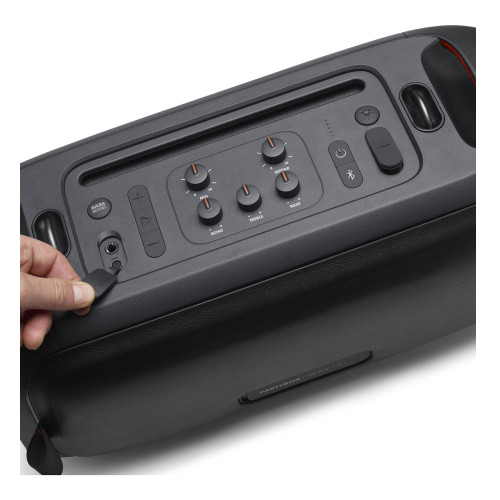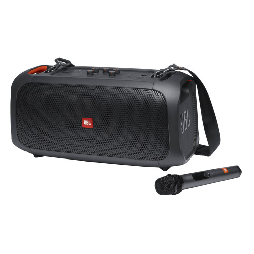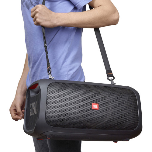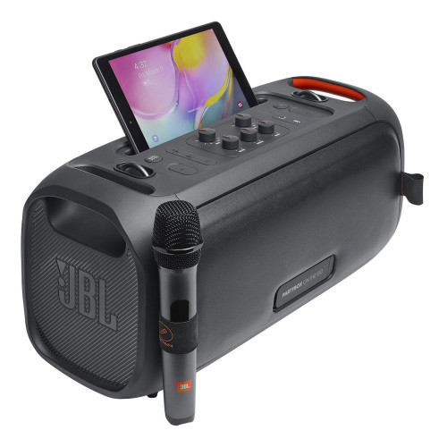 اسپیکر PARTY ON THE GO محصولی از شرکت بزرگ JBL است. این اسپیکر زیبا در ابعاد 31.2*36.7*60 سانتی متر و با وزن 7.5 کیلو گرم ، دارای یک بند روی شانه ای است که حمل نقل این وسیله را برای شما بسیار آسان میکند. جنس بدنه اسپیکر قابل حمل JBL مدل PARTY ON THE GO از پلاستیک فشرده و فلز است و طراحی آن به گونه ای است که این محصول در برابر آب و گرد غبار مقاوم باشد. شما میتوانید با خیال راحت از این اسپیکر در تور های بیابان گردی یا لب ساحل یا حتی درون استخر استفاده کنید. کمپانی JBL برای زیباتر شدن محصول خود از رقص نور استفاده کرده است که این رقص نور هماهنگ با موزیک درحال پخش در پنل جلو نور افشانی میکند. این اسپیکر قابل حمل دارای دو باند 1.75 اینچی و یک وفوور 5.25 اینچی با قدرت خروجی ۱۰۰ واتی صدای فوق العادهای همراه با باس برای شما ایجاد میکند. این محصول دارای قابلیت Bass Boost برای تولید صدای فراگیر و همچنین دارای تکنولوژی TWS است. با این تکنولوژی میتوانید دو اسپیکر را به یکدیگر متصل کنید و از طریق این اتصال صدایی بلندتر دریافت کنید. این محصول انرژی مورد نیاز خود را از باتری لیتیوم – یون با ظرفیت 2500 میلی آمپر تامین میکند. باتری تعبیه شده در این اسپیکر پس از 3.5 ساعت به طور کامل شارژ میشود و شما میتوانید 6 ساعت به طور مداوم از این اسپیکر استفاده کنید. این محصول دارای نشانگر میزان شارژ نیز است. برای اتصال به اسپیکر جی بی ال مدل PARTY ON THE GO شما میتوانید از درگاه جک 3.5 میلی متری (AUX) یا از طریق بلوتوث نسل 4.2 استفاده کنید همچنین داری درگاه USB برای پخش موسیقی نیز است. اسپیکر بلوتوثی جی بی ال مدل PARTY ON THE GO دارای دو میکروفون است که یک میکروفون درون خود اسپیکر تعبیه شده است و یک میکروفون بیسیم هم همراه اسپیکر هست. این میکروفون برای قابلیت کارائوکه ای که این محصول دارد، تعبیه شده است. بر روی این اسپیکر ولوم هایی قرار گرفته است که شما میتوانید با استفاده از آنها صدای میکروفون یا گیتار خود را تنظیم و اکولایز کنید. برای بهتر استفاده کردن از این اسپیکر بهتر است اپلیکیشن اختصاصی PartyBox را بر روی گوشی که به اسپیکر متصل میکنید، نصب کنید.