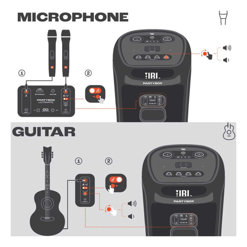 Party Box Ultimate از طریق بلوتوث نسخه 5.3 و اتصال وایفای به دستگاهها متصل میشه. این اتصال بیسیم پایدار، صدایی شفاف و بدون تاخیر رو تضمین میکنه. اسپیکر از پروفایلهای صوتی A2DP V1.3 و AVRCP V1.5 پشتیبانی میکنه که برای پخش موسیقی با کیفیت بالا اهمیت زیادی دارن.