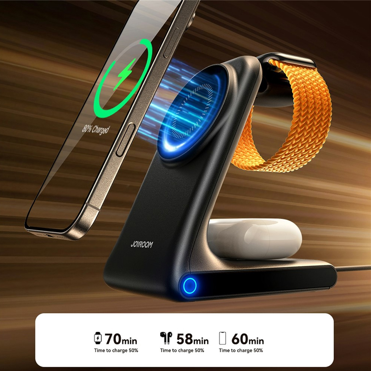 | سایر ویژگیها | شارژ همزمان سه دستگاه، طراحی عمودی ۳ در ۱، پایه مغناطیسی، شارژ سریع، حالت ساعت کنار تخت و پایه تماس ویدیویی، حفاظت هوشمند (کنترل دما، ولتاژ بیشازحد، اتصال کوتاه و جریان بیشازحد) |
