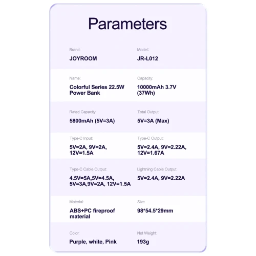 | شدت جریان خروجی | کابل لایتنینگ: 5V-2.4A; 9V-2.22A، کابل تایپ سی: 5V-2.4A; 9V-2.22A; 12V-1.67A، پورت تایپسی: 5V-2.4A; 9V-2.22A; 12V1.67A، خروجی چند پورت: 5V-3A |