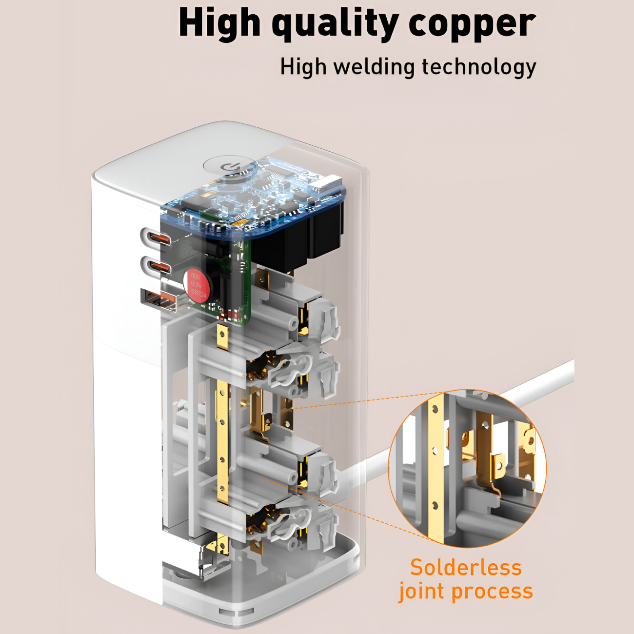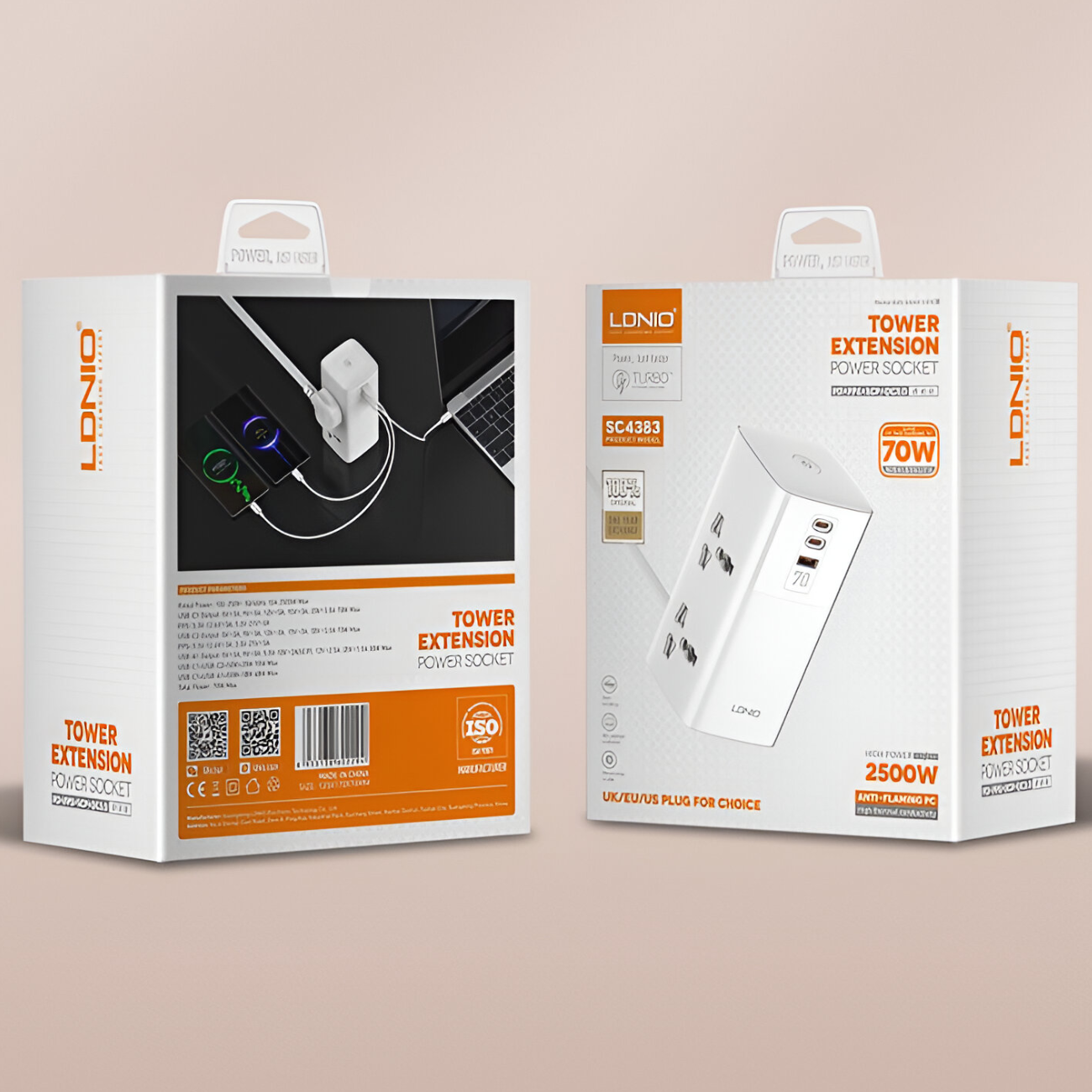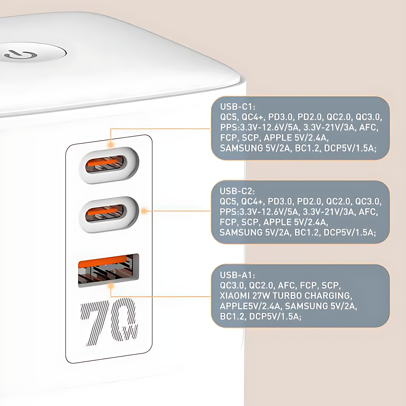 سایر ویژگی ها | - شارژ سریع PD 70W، - مجهز به فناوری GaN، - پشتیبانی از انواع پروتکلهای شارژ سریع، - قابلیت شارژ سریع لپ تاپ، - شارژ ایمن با حفاظت 9گانه، - طراحی عمودی جهت صرفهجویی در فضای کار، - محافظت در برابر برقگرفتگی و نوسانات |