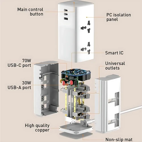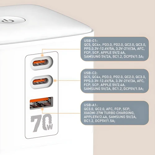 | سایر ویژگی ها | - شارژ سریع PD 70W، - مجهز به فناوری GaN، - پشتیبانی از انواع پروتکلهای شارژ سریع، - قابلیت شارژ سریع لپ تاپ، - شارژ ایمن با حفاظت 9گانه، - طراحی عمودی جهت صرفهجویی در فضای کار، - محافظت در برابر برقگرفتگی و نوسانات |