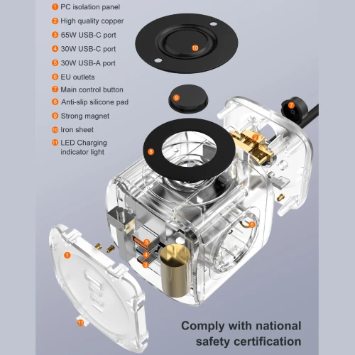 | سایر ویژگی ها | - شارژ سریع PD 65W، - پشتیبانی از انواع پروتکلهای شارژ سریع، - قابلیت شارژ سریع لپ تاپ، - شارژ ایمن با حفاظت چندگانه، - طراحی مکعبی جهت صرفهجویی در فضای کار، - پد سیلیکونی ضدلغزش با آهنربای داخلی برای نصب روی سطوح فلزی، - چراغ نشانگر LED سفید کمنور (نمایش وضعیت اتصال) |