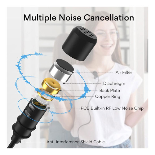علی رغم اینکه که MAONO AU-100 یک میکروفون هندزفری است، بعلت داشتن ویژگی حذف نویز در از بین بردن نویزهای محیطی بسیار خوب عمل میکند و به معنای واقعی کلمه هر نوع سر و صدای مزاحم را حذف میکند. این میکروفون دارای کاهش نویز 7 لایهای است که بواسطه ورقه آلومینیومی با کیفیت بالا، تراشه صدای حرفهای و کابل ضد پارازیت باعث کاهش صدای باد و اکو میشود و صدای واضحتری برای شما فراهم میکند. ساختار پیشرفتهتر و کابل بلند 236 اینچی این میکروفون به ضبط صداهای بلند و شکننده هنگام مصاحبه، پخش مستقیم از پادکست، تماس در اسکایپ، آموزش، ضبط صدا و ویدئو در یوتیوب و غیره کمک میکند