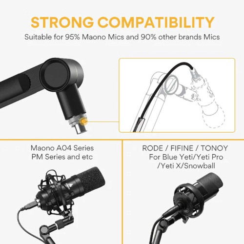 - پایه میکروفون ماونو AU-BA91 مخصوص چه میکروفونهایی هست؟ این محصول با همه میکروفونهایی که قابلیت اتصال به پایه بازویی رو دارن سازگاره، به شرطی که وزنشون تا 1.8 کیلوگرم باشه.