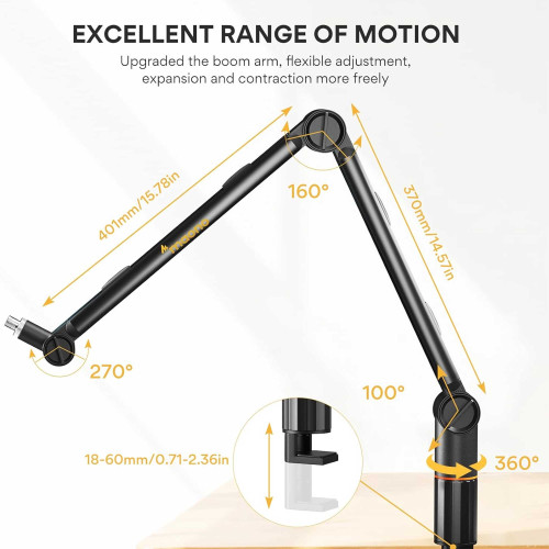 پایه بازویی میکروفون ماونو مدل AU-BA91، یه محصول خیلی محکم و باکیفیته که با وزن حدودی 1.7 کیلوگرم تولید شده و میتونه وزنی تا 1.8 کیلوگرم رو هم به راحتی تحمل کنه. برای نگه داشتن میکروفون روی این پایه یه گیره در نظر گرفته شده که 18 تا 60 سانتیمتر باز میشه یعنی میتونین مدلهای مختلف میکروفون رو داخلش جا بدین.