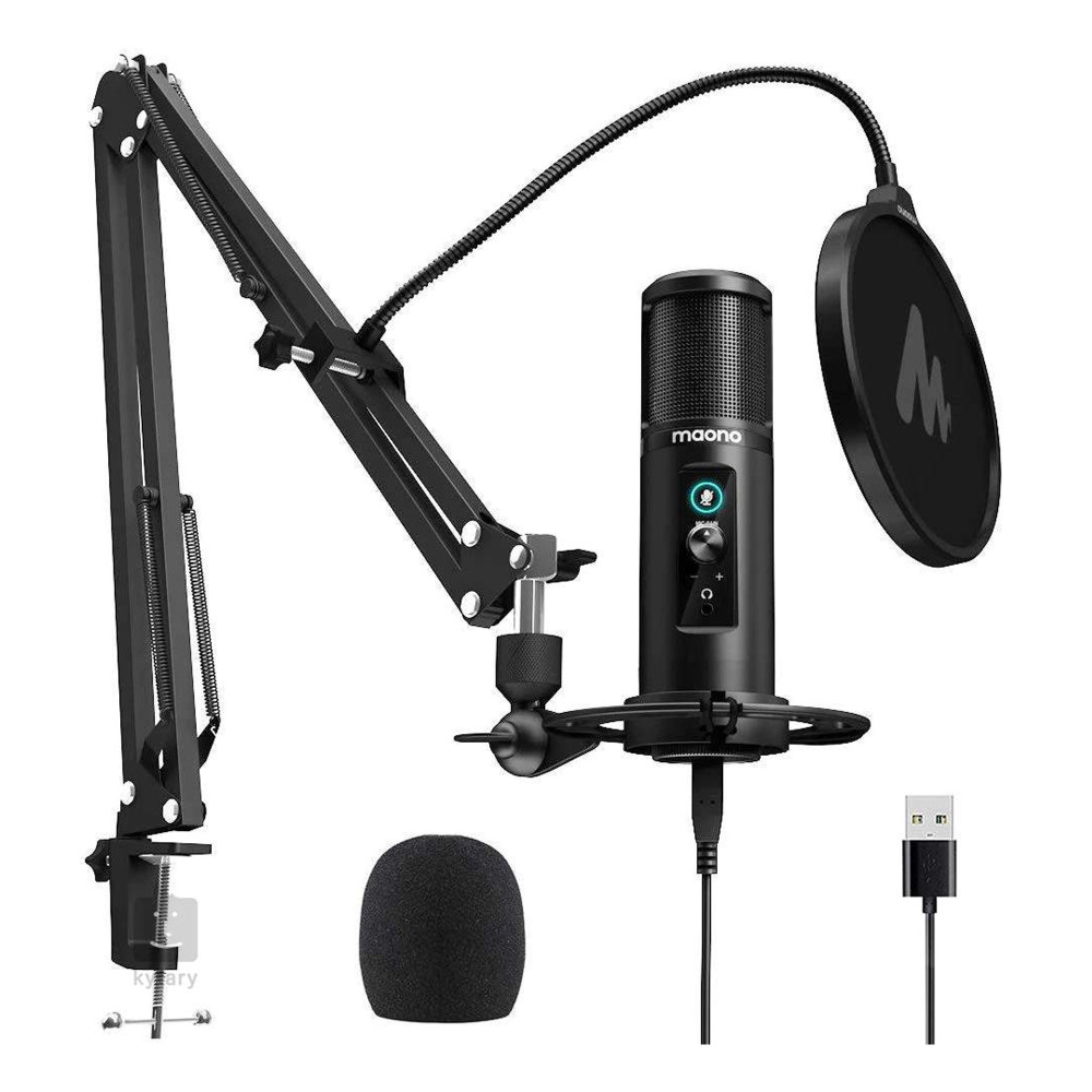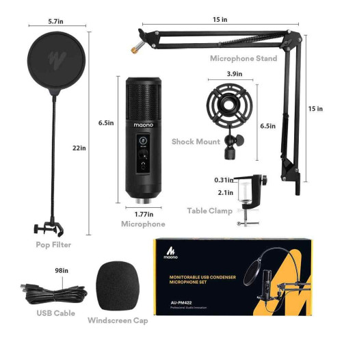 میکروفن استودیویی MAONO مدل AU-PM422 یک میکروفون کندانسری با درگاه خروجی USB است که صدایی با کیفیت عالی ارائه میدهد. این کیت میکروفونی شامل یک میکروفون ماونو، بازویی، شوک مونت، پاپ فیلتر، فیلتر نرم کننده صدا و کابل USB است.