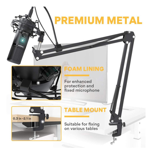 این میکروفن با کیفیت، یک پایه بازویی و پایه ضد شوک فلزی دارد که برای ایزوله سازی میکروفون از نویز، شوک و لرزشهای محیطی قرار داده شده است. بازویی مستحکم آن توسط گیره قابل تنظیم به لبه میزهایی تا ضخامت حدود 5 سانتیمتر متصل می شود. پاپ فیلتر و فوم بادگیر این مجموعه میکروفون استودیویی نیز میتواند تأثیر منفی ناشی از حروف انفجاری و صدای باد را به حداقل رسانده تا صدایی واضحتر داشته باشید. چه در خانه در حال ضبط باشید و چه در استودیو، میکروفون AU-PM422 کیفیت کار شما را افزایش میدهد.