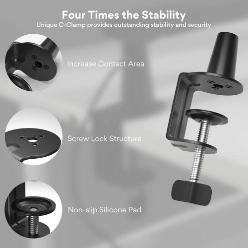 ابعاد کلی این پایه حدود 39 در 12 در 9 سانتیمتره و با توجه به طراحی تاشو و بازویی، فضای زیادی روی میز اشغال نمیکنه. نکتهی جالب اینجاست که پایه از طریق گیرهی محکم به لبهی میز متصل میشه و این گیره برای میزهایی با ضخامت تا ۶ سانتیمتر کاملاً مناسبه. قابلیت چرخش ۳۶۰ درجه باعث شده بهراحتی بتونین زاویهی موردنظرتون رو پیدا کنین و با چهار پیچ قابل تنظیم هم میشه پایه رو در بهترین وضعیت ممکن فیکس کرد.