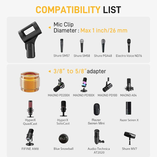 بیشتر میکروفونهایی که وزنشون زیر ۱ کیلوگرمه میتونن با این پایه استفاده بشن. وجود آداپتور تبدیل پیچ هم کمک میکنه با انواع اتصالها سازگار باشه.