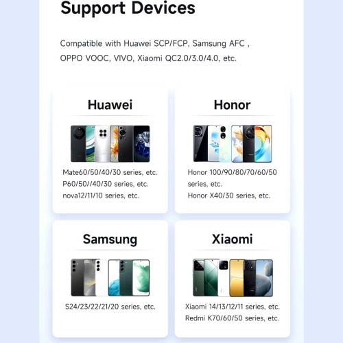 | سازگار با | SCP/FCP, Samsung AFC, OPPO VOOC, VIVO, Xiaomi QC2.0/3.0/4.0 و .... |