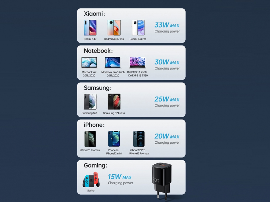 | ولتاژ خروجی | حداکثر 24 وات : خروجی USB-C+USB-A، (33 وات حداکثر) 5V/3A، 9V/3A، 12V/2.5A، 15V/2A، 20V/1.5A، PPS: 3.3V-11V/3A : خروجی USB-C، (حداکثر 30 وات) 5V/4.5A، 9V/3A، 12V/2.5A، 20V/1.5A : خروجی USB-A |