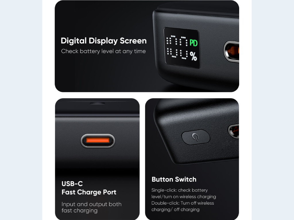 | توان خروجی | USB-C: 5V⎓3A, 9V⎓2.22A, 12V⎓1.67A، ، Wireless: 15W/10W/7.5W/5W |