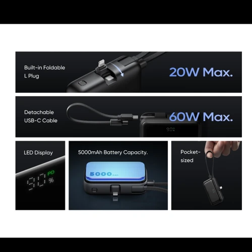 امکانات و قابلیتها | دارای کانکتور خروجی 90 درجه لایتنینگ 20 واتی با قابلیت تاشوندگی، دارای کابل تایپ سی متصل 60 واتی با قابلیت جداشدن کابل |