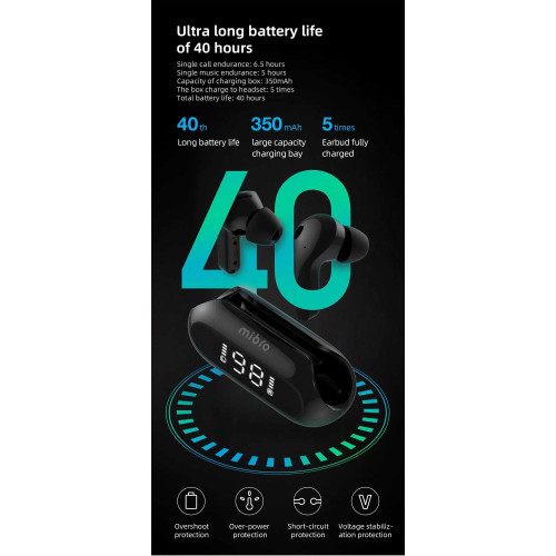 هندزفری بلوتوثی میبرو مدل EARBUDS 3 ارتباطش رو با بلوتوث نسخه 5.3 با بقیه دستگاهها برقرار میکنه و حتی توی فاصله 10 متری از منبع صدا هم بهترین کیفیت رو داره. منبع انرژی این هدفون، باتری لیتیوم یون پلیمره؛ ضمن اینکه برای هر گوشی ظرفیت 40میلیآمپر ساعت و برای باکس شارژش ظرفیت 350میلیآمپر ساعت در نظر گرفته شده. با این مشخصات، زمان لازم برای شارژ کامل باکس حدود 2 ساعت و برای هرکدوم از ایرپادها حدود 1.5 ساعته. بعد از تکمیل این انرژی هم توی حالت پخش موسیقی تا حدود 6.5 ساعت و توی حالت استندبای تا حدود 40 ساعت شارژ داره. خود کیس هم به شکل یه شارژر همراه عمل میکنه و یه نمایشگر روی خودش داره که میزان شارژش رو بهتون نشون میده.