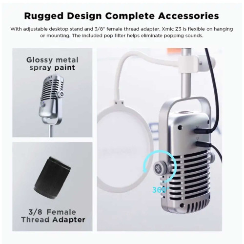 میکروفون XMIC Z3 با وزن 540 گرم و ابعاد 100×105×215 میلیمتر طراحی شده. این محصول به دلیل پایه رومیزی که داره، خیلی راحت روی هر سطح صافی قرار میگیره. یه کابل به طول 2 متر هم براش در نظر گرفته شده؛ بنابراین، میشه گفت که محدودیتی برای جابهجا شدن شما ایجاد نمیکنه.