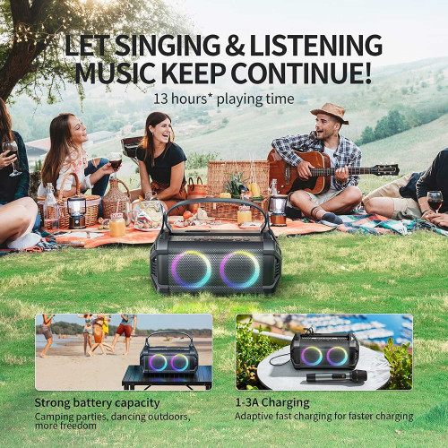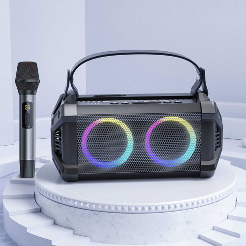 سایر مشخصات اسپیکر | دارای دستگیره برای حمل و نقل آسان | قابلیت KARAOKE | قابلیت تغییر حالت نور RGB | تنظیم اکو و ولوم روی میکروفون | قابلیت برقراری تماس از طریق میکروفون های این اسپیکر |