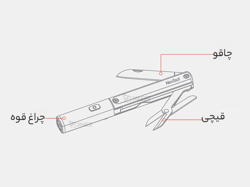 - چراغ قوه، چاقوی جیبی و قیچی همراه