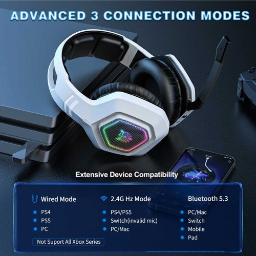 این هدست از سه نوع اتصال بهره میبره: دانگل USB، بلوتوث نسخه 5.3 و جک 3.5 میلیمتری. محدوده عملکرد بیسیم اون تا 15 متره که آزادی حرکت رو به کاربر میده. درایورهای 50 میلیمتری صدای شفاف و بیس قدرتمندی تولید میکنن. باتری 1000 میلیآمپری این هدست در 2 ساعت شارژ میشه و در حالت RGB تا 25 ساعت و بدون نورپردازی تا 60 ساعت شارژدهی داره.