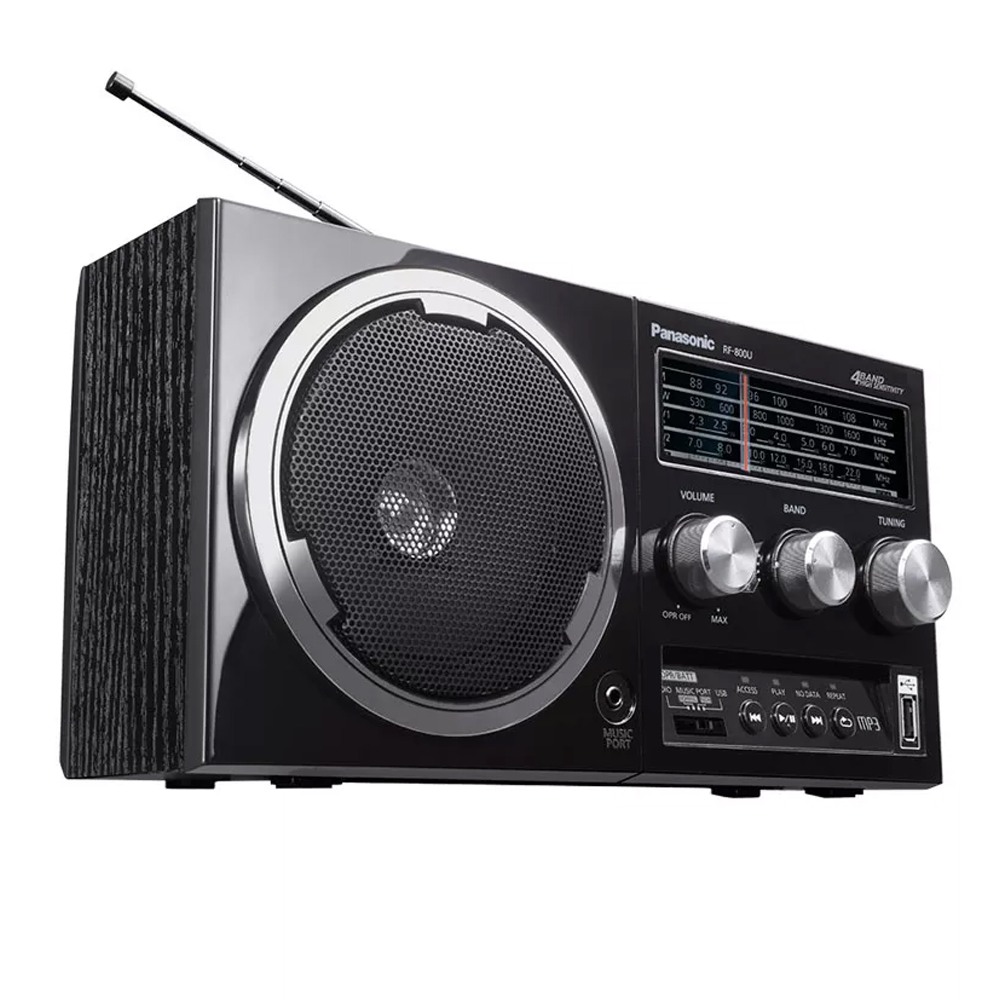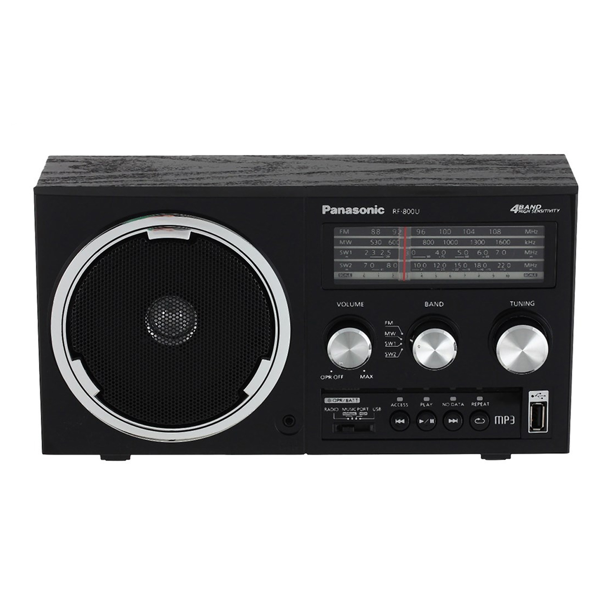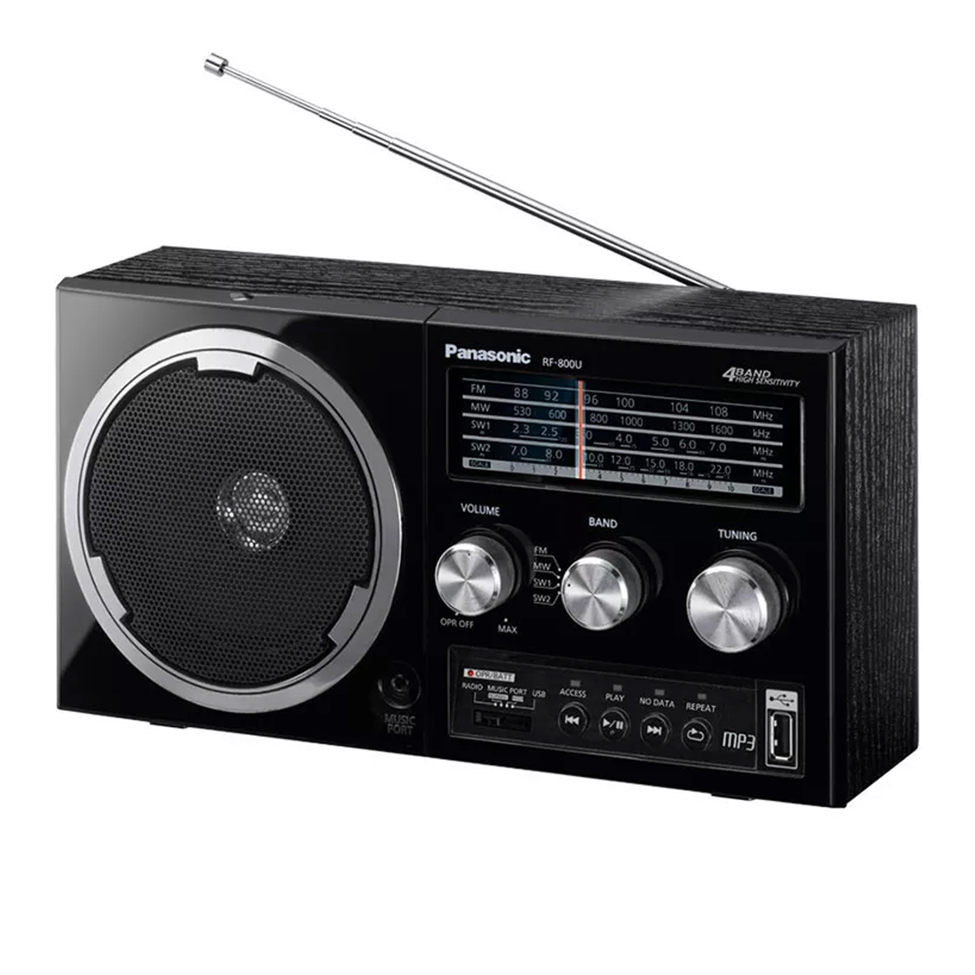 رادیو پرتابل مدل RF-800U، محصولی از شرکت پاناسونیک، برای کسانی که با ظاهر و طراحی کلاسیک اهمیت میدهند میتواند گزینه مطلوبی باشد. این محصول علاوه بر دارا بودن قابلیت پیدا کردن امواج رادیویی FM و SW به صورت دستی، به دلیل داشتن ورودی USB و ورودی فلش مموری، میتواند فایلهای MP3 را نیز پخش کند و شما میتوانید علاوه بر گوش دادن به رادیو، از شنیدن موسیقیهای خود نیز لذت ببرید. یکی از ویژگیهای جذاب RF-800U ظاهر جذاب و کلاسیک آن است که با دارا بودن رنگ تیره به همراه دکمه های تعبیه شده بر روی آن، به فضای خانه یا محل کار شما زیبایی خاصی می بخشد. اشخاصی که سلیقههای خاصی دارند یا طرفدار طراحی کلاسیک هستند قطعا این مدل برای آنها جذابیتی خاص خواهد داشت که البته گزینهی مناسبی برای هدیه دادن نیز خواهد بود. این محصول به راحتی قابل حمل و جایگیری در انواع سطوح مختلف و کنج دیوار ها است و شما میتوانید به راحتی از طریق چهار عدد باتری قلمی LR20 از این رادیو در هر مکانی که خواستید استفاده کنید. در طراحی داخلی این رادیو یک ورودی مخصوص هدفون تعبیه شده که برای زمان هایی که میخواهید بدون ایجاد سر و صدا و اذیت کردن اطرافیان یا در نیمی از شب با اتصال هدفون میتوانید از آن استفاده نمایید. این مدل قابلیت جستجوی کانالها را به صورت خودکار ندارد و با بهرهمندی از بلندگوهای دوطرفه میتواند صدا را بدون اعوجاج و به صورت صاف پخش کند. ابعاد این رادیو 97× 14 × 27 سانتی متر و وزن آن معادل 1900 گرم است. این رادیو دارای یک آنتن 80 سانتیمتری است تا مشکلی بابت دریافت امواج رادیویی به وجود نیاید.