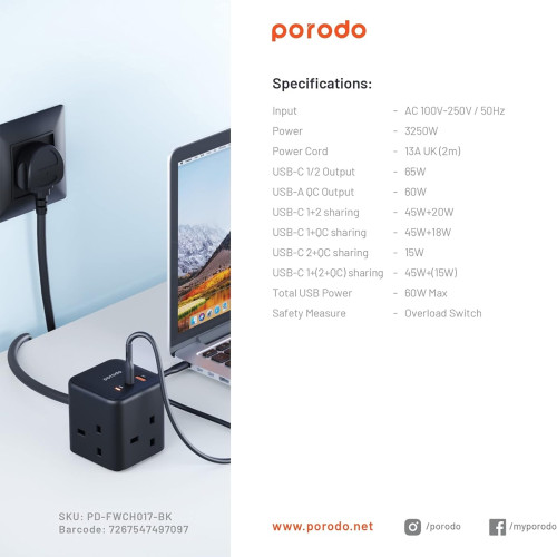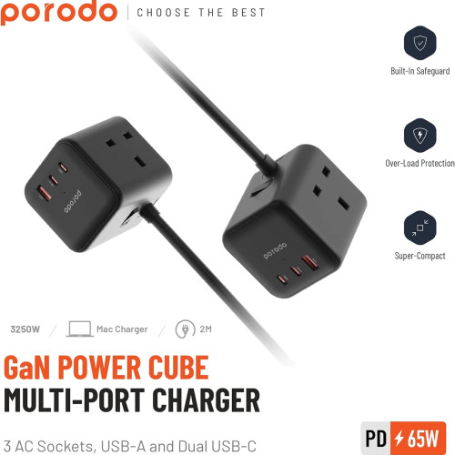 Porodo GAN POWER CUBE MULTI PORT CHARGER PDFWCH017BK