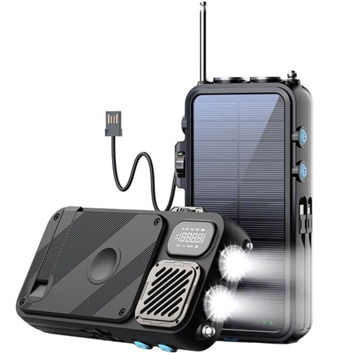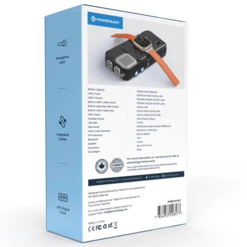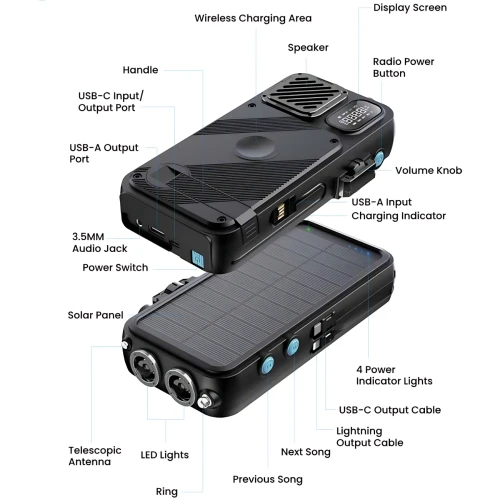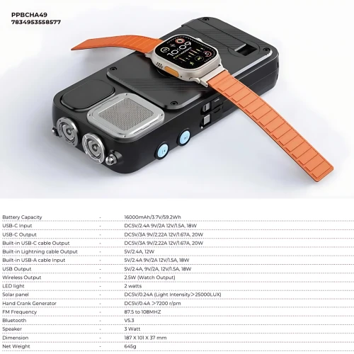 | قابلیتهای ویژه | پنل خورشیدی، کابل تایپ سی و لایتنینگ متصل به بدنه، دارای چراغ قوه، اسپیکر بلوتوث، ساعت دیجیتالی، رادیو FM، شارژر وایرلس اپل واچ، دسته دینام دستی |