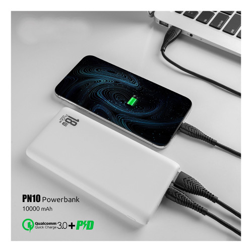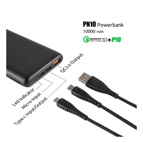 پاور بانک مدل PN10 با ظرفیت ۱۰۰۰۰ میلی آمپر ساعت، دارای دو درگاه ورودی هست که شامل یک پورت Micro USB و یک پورت Type-C میشه. همچنین این محصول از یک درگاه خروجی که شامل یک پورت USB و یک پورت Type-C تشکیل شده. این پاور بانک از فناوریهای Qualcomm Quick Charge 3 و Power Delivery پشتیبانی میکنه و از طریق درگاه Type-C قابلیت شارژ سریع داره. با شارژ بیسیم و پشتیبانی از دستگاههای مختلف از جمله گوشیهای هوشمند، ساعتهای هوشمند و تبلتها، این پاور بانک انعطاف پذیری بالایی رو از خودش نشون میده. باتری لیتیوم-پلیمر این محصول برای شارژ کامل به ۵ ساعت زمان نیاز داره و امکان شارژ تبلت با شدت جریان ۲.۰ آمپر و بالاتر رو پشتیبانی میکنه.