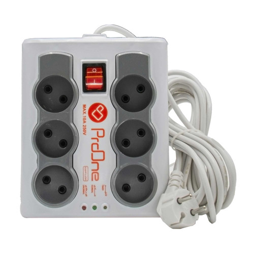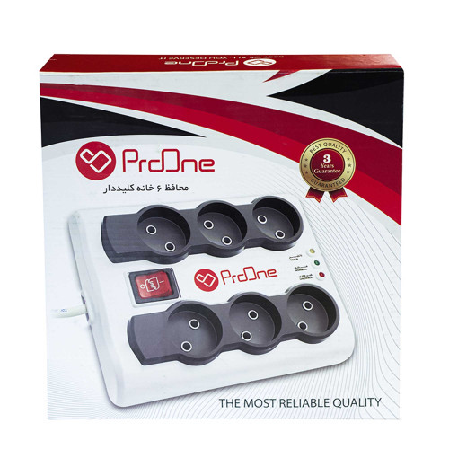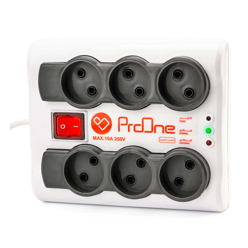 محافظ برق ۶ خانه پرووان مدل PPS610 از برند ProOne هست که یه کلید روشن خاموش داره و 6 تا پریز روی اون دیده میشه. از این محصول دو مدل در بازار وجود داره که یکی با سیم 1.5 متره و اون یکی با سیم 3 متر. یه نشانگر LED هم دارن که وضعیتشون رو بهتون نشون میده و با رنگ قرمز، سبز و مشکی ایجاد شده. البته کلید روشن خاموش هم دارن.