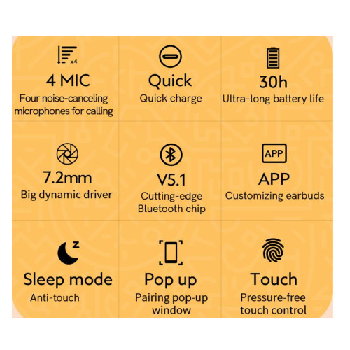 | سایر مشخصات هدفون | جفت شدن سریع هدفون ها باهم | پشتیبانی از دستیار صوتی | امکان استفاده جداگانه از هر ایرباد | حالت Sleep Mode برای جلوگیری از لمس نخواسته | اپلیکیشن اختصاصی QCY برای تنظیم و شخصیسازی صدا |