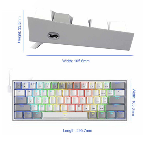 این کیبورد گیمینگ برند ردراگون در مجموع ۶۱ کلید داره که همهی اونا مکانیکال هستن. طراحی Compact باعث شده فضای کمتری روی میز اشغال کنه و حملونقلشم راحتتر باشه. از نظر ابعاد دقیق یا وزن، بسته به سری تولید ممکنه کمی تفاوت وجود داشته باشه، اما چیزی که مهمه اینه که ردراگون تلاش کرده حداکثر امکانات رو در حداقل فضا ارائه بده. بدنهی کیبورد از مواد باکیفیت ساخته شده تا در برابر فشارهای ناشی از بازیهای طولانیمدت و حتی بعضی ضربههای اتفاقی مقاوم باشه. این طراحی مینیمال برای گیمرهایی که به سبک مسابقهای (eSports) علاقه دارن و نیاز دارن موس رو با آزادی بیشتری حرکت بدن، خیلی کاربردیه.