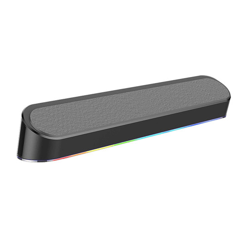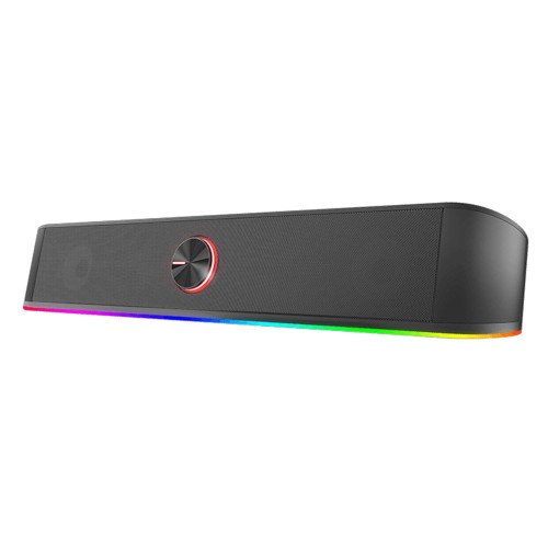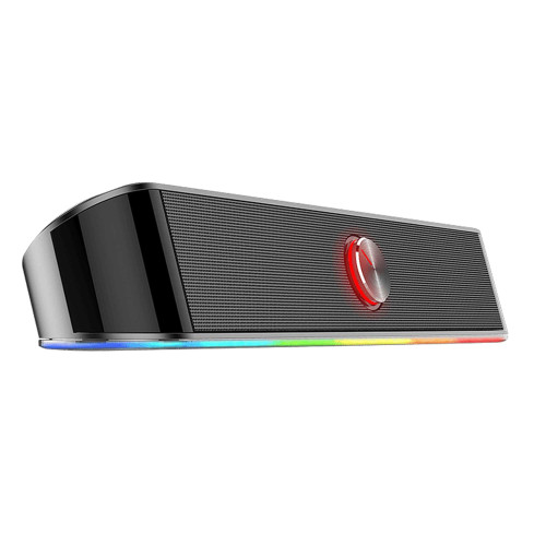 بدنه اسپیکر از پلاستیک باکیفیت ساخته شده که مقاومت خوبی داره و در عین حال سبک هست. طراحی خطی و کشیده این مدل باعث شده جلوهای متفاوت نسبت به اسپیکرهای رومیزی دو تکه داشته باشه. کلیدهای مکانیکی برای کنترل صدا روی بدنه قرار گرفتن تا مدیریت تنظیمات راحتتر باشه. نورپردازی RGB هم ظاهر این اسپیکر رو مدرنتر و جذابتر کرده و محیط گیمینگ یا میز کار رو حسابی زیبا میکنه.