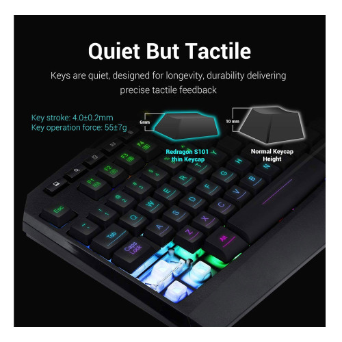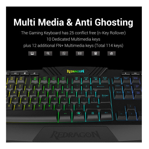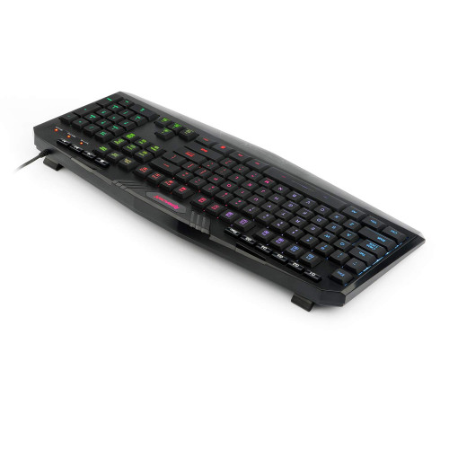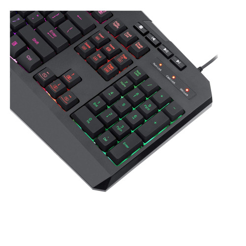 اگر شما به بازیهای کامپیوتری علاقه دارید و قصد دارید یک گیمر حرفهای باشید باید لوازم مخصوص بازی را تهیه کنید. یکی از مهمترین لوازم کیبورد است. رددراگون یکی از برندهایی است که در زمینه تولید محصولات مخصوص بازی فعالیت دارد. کیبورد مخصوص بازی رددراگون مدل K503 RGB برای افرادی که قصد تهیه کیبورد مخصوص بازی دارند گزینه مناسبی است. این مدل از نوع با سیم بوده و از مهمترین ویژگیهای این کیبورد میتوان به نور RGB اشاره کرد. کیبورد مخصوص بازی رددراگون مدل K503 RGB ترکیبی از طراحی مدرن و کلاسیک دارد. گوشههای این کیبورد خطهای شکسته داشته که این طراحی جذابیت این محصول را دو چندان کرده است. برای این مدل از 104 عدد کلید استفاده شده است. فاصله میان کلیدهای کیبورد باعث شده تا استفاده از این مدل برای گیمرها آسان باشد. این فاصله استاندارد بوده و فضای کافی برای قرار گرفتن انگشت را در اختیارتان قرار میدهد. مهمترین وجه تمایز این کیبورد با کیبوردهای ساده استفاده از نور RGB است. در سمت راست این کیبورد 3 نشانگر LED دیده میشود که به شما وضعیت Win Lock، Caps Lock و Num Lock را نمایش میدهد. یکی از مهمترین قابلیتهایی که برای این مدل تعبیه شده 12 کلید میانبر و 8 کلید مستقل برای مدیریت است. با استفاده از این دکمهها شما به تمامی دستورهای مهم دسترسی آسان خواهید داشت. استراحتگاهی که برای این کیبورد تعبیه شده ابعاد استانداردی دارد و برای قرار گرفتن مچ دست و درست کردن زاویه دست طراحی مناسبی دارد. رددراگون تلاش کرده تا استفاده از استراحتگاه باعث افزایش ابعاد کیبورد نشود و میتوان گفت در این امر موفق شده است. برای اتصال این کیبورد از پورت USB استفاده شده است. برخلاف کیبوردهای قدیمی که USB-2 داشتند امروزه تمامی لوازم گیمرها به USB مجهز شده اند. یکی از نکاتی که لوازم یک گیمر را با کاربر عادی متمایز میکند نور RGB است. از نورهای RGB برای بالابردن زیبایی ظاهر لوازم به خصوص در تاریکی استفاده میشود. رددراگون برای کیبورد مخصوص بازی مدل K503 RGB قابلیت تنظیم نور 4 حالت پیش فرض را تعبیه کرده است. شما با توجه به نور سایر لوازمتان میتوانید یکی از این حالات را انتخاب کنید. شاید استفاده از نور برای ماوس و هدفون بیشتر جنبه ظاهری و نمایش داشته باشد اما در کیبورد این ویژگی مانند نور پس زمینه عمل کرده و در تاریکی و شب به آسانی قادرید از کیبوردتان استفاده کنید.