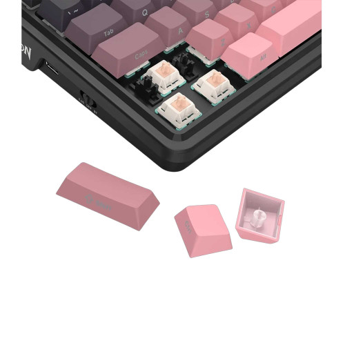 یکی از مزیتهای مهم این کیبورد، پشتیبانی از سه نوع اتصال مختلف هست: بلوتوث، دانگل بیسیم 2.4 گیگاهرتز و کابل USB-C قابل جداسازی. این انعطافپذیری باعث میشه بتونین هم روی سیستم دسکتاپ ازش استفاده کنین و هم بهراحتی به لپتاپ یا حتی گوشی وصلش کنین. کلیدها از نوع مکانیکال با سوئیچهای Dragon Chant (Linear) هستن که هم دوام فوقالعادهای دارن (تا ۵۰ میلیون بار کلیک) و هم صدای کمتری تولید میکنن. پشتیبانی از هاتسواپ برای سوئیچهای 3/5 پین باعث میشه بتونین نوع سوئیچها رو بدون نیاز به لحیمکاری تغییر بدین. از طرفی، طراحی گسکت با ۵ لایه جذب صدا شامل فوم و پد سیلیکونی، باعث میشه صدای تایپ نرمتر و دلپذیرتر باشه. باتری داخلی ۳۰۰۰ میلیآمپرساعتی داره که عمر شارژ بسیار خوبی ارائه میده. نورپردازی RGB قابل تنظیم با حالتهای مختلف هم ظاهر فوقالعادهای به میز گیمینگتون میده.
