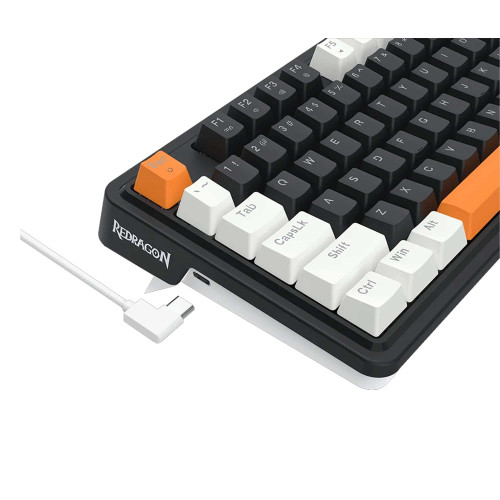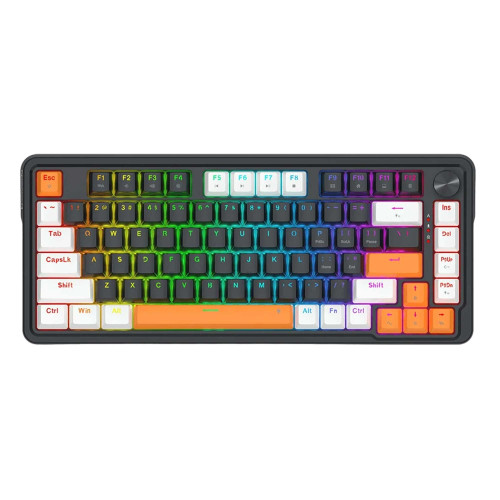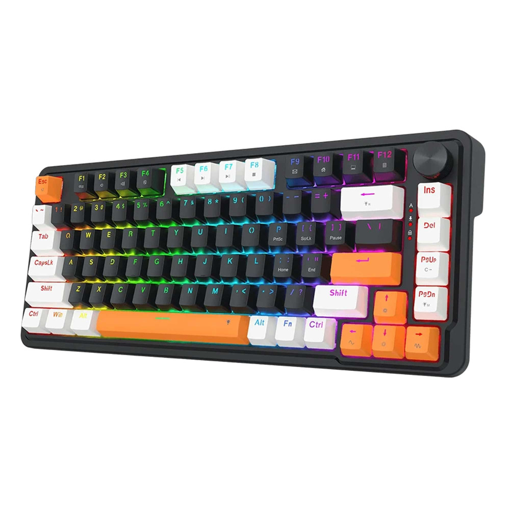 این کیبورد با وزن ۸۳۰ گرم و ابعاد ۳۳۵ در ۱۴۰ میلیمتر، جزو مدلهای فشرده و خوشدسته. ضخامت ۳۷ میلیمتر و طراحی ارگونومیکش باعث میشه هم روی میزهای گیمینگ و هم در محیطهای کاری کاملاً مناسب باشه. بدنه از پلاستیک ABS با صفحه آلومینیومی ساخته شده که هم سبک و هم مقاومه. کابل ۱.۸ متری با روکش بافتهشده (Braided) دوام بالایی داره و با رابط USB-C قابلجداسازی طراحی شده تا هم اتصال پایدار و هم حمل آسان فراهم بشه. این مدل ۸۱ تا کلید داره که همگی بهصورت دقیق و منظم چیده شدن تا فضای دست شما موقع بازی یا تایپ کاملاً آزاد باشه. ترکیب رنگی سفید، نارنجی و آبی هم ظاهر خاصی بهش داده که با نور RGB جلوهای واقعاً چشمگیر پیدا میکنه.
