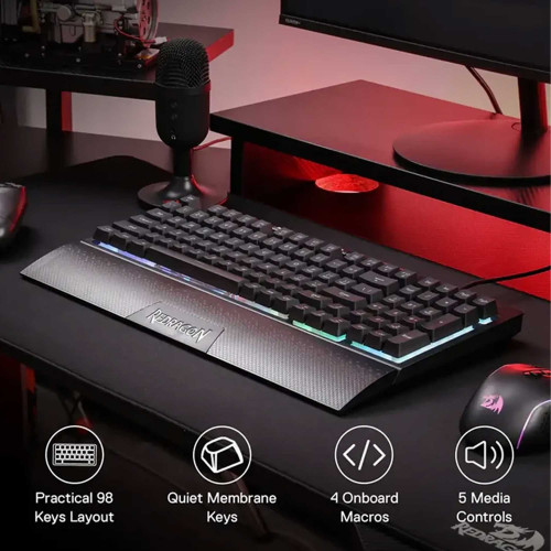 کیبورد گیمینگ Redragon K515 ابعادی برابر با ۴۴۷ در ۲۰۰ میلیمتر و ضخامت ۳۸ میلیمتر داره. بدنه از پلاستیک فشرده ABS ساخته شده که هم سبک و هم مقاومه، و در برابر ضربه یا فشار مقاومت بالایی داره. وزن ۵۸۰ گرم باعث شده کیبورد روی میز کاملاً ثابت بمونه و موقع بازی یا تایپ، حس پایداری خوبی منتقل کنه. کابل ۱.۸ متری USB-C با روکش بافتهشده داره که از پیچخوردگی و پارگی جلوگیری میکنه. تعداد کلیدها ۹۸ تا هست و در سمت چپ، ۴ کلید ماکرو قابل برنامهریزی قرار گرفته تا بتونین برای بازیها یا میانبرهای خاص، عملکرد دلخواهتون رو تنظیم کنین. علاوه بر اون، وجود Wrist-Rest مغناطیسی (استراحتگاه مچ دست) باعث میشه استفادهی طولانیمدت از کیبورد راحتتر بشه و فشار روی دست کمتر بیاد.