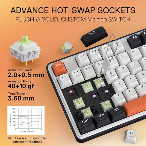 این مدل از سه نوع اتصال مختلف پشتیبانی میکنه: بلوتوث، دانگل بیسیم 2.4 گیگاهرتز و کابل USB-C قابل جداسازی. یعنی بسته به شرایط، هم میتونین بیسیم بازی کنین و هم بهصورت باسیم ازش استفاده کنین. کلیدها از نوع مکانیکال با سوئیچهای Mint Mambo (Linear) هستن که عملکرد سریع و روانی دارن و تا ۵۰ میلیون بار کلیک دوام میارن.